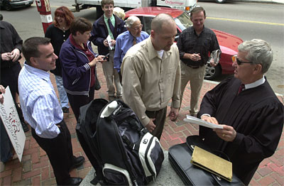 Justice of the Peace Michael Kuhn arrives and inspects the marriage license. Photo by Toni Carolina